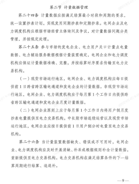 参与市场的发电企业、电力用户关口计量点电量数据、电力辅助服务数据根据计量装置确定,电网企业和电力调度机构应保证计量数据准确、完整,并按结算时序要求传输至电力交易机构。